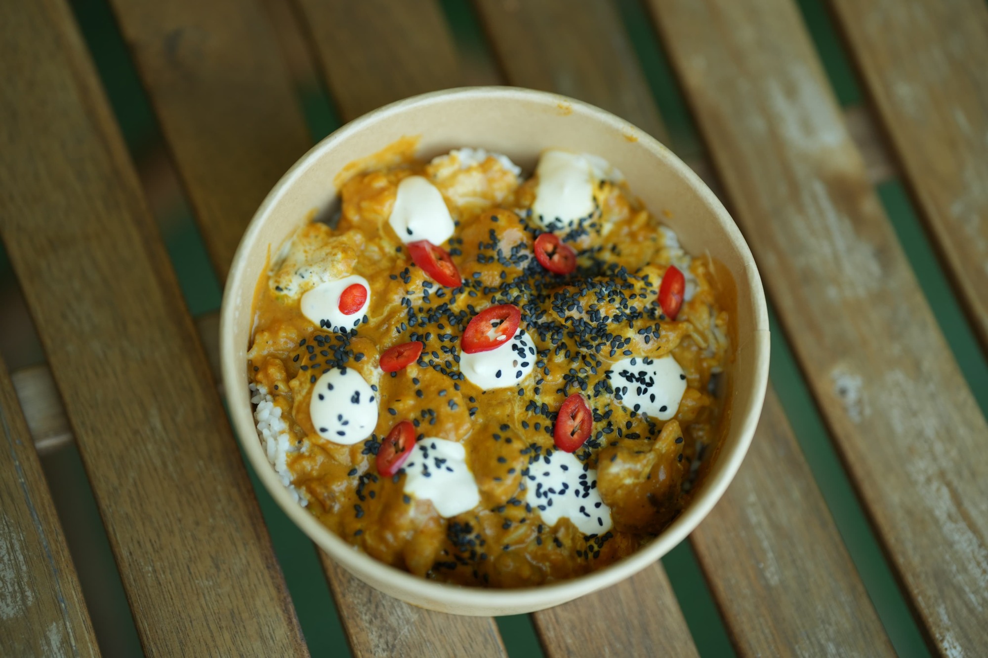 Riža, crispy piletina, katsu umak, mladi luk, sezam, svježi krastavci, coleslaw salata