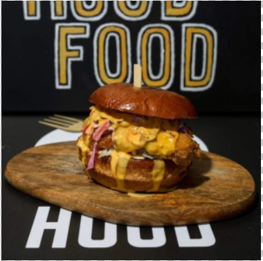 Brioche pecivo, vege pljeskavica, iceberg salata, kiseli krastavci, luk, rikola, smoke umak